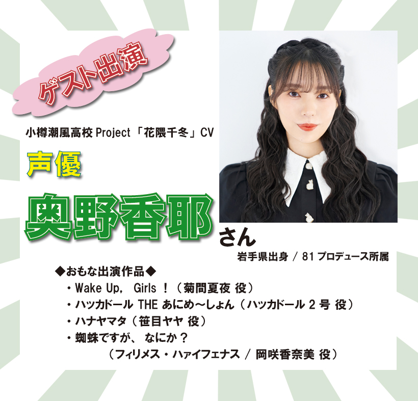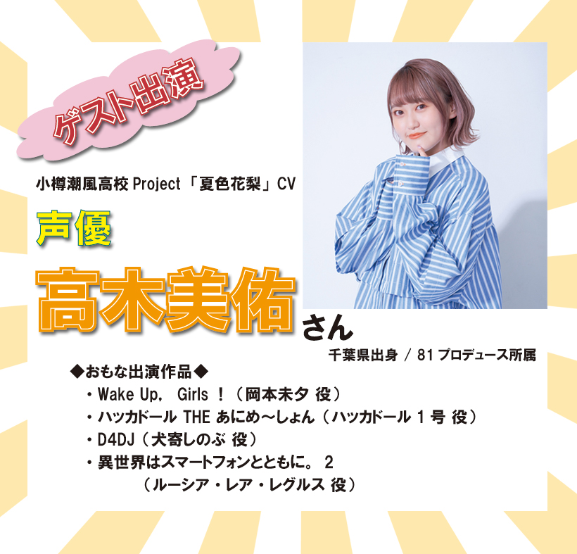 スペシャルゲストには、高木美佑さん(「夏色花梨」CV担当)と、奥野香耶さん(「花隈千冬」CV担当)にご出演いただきました。